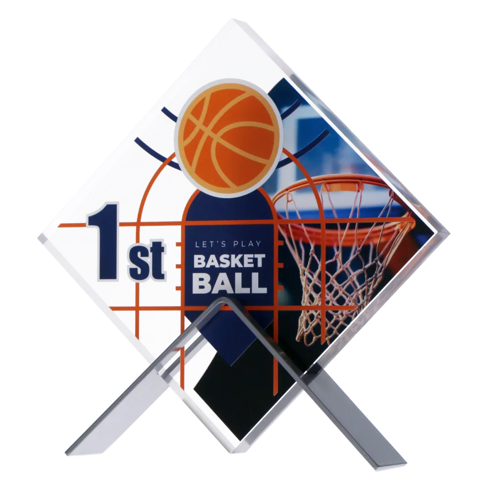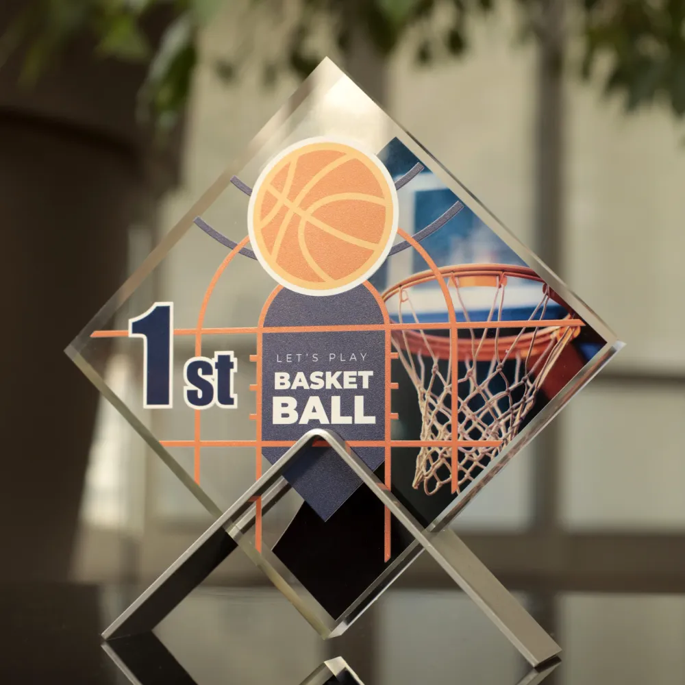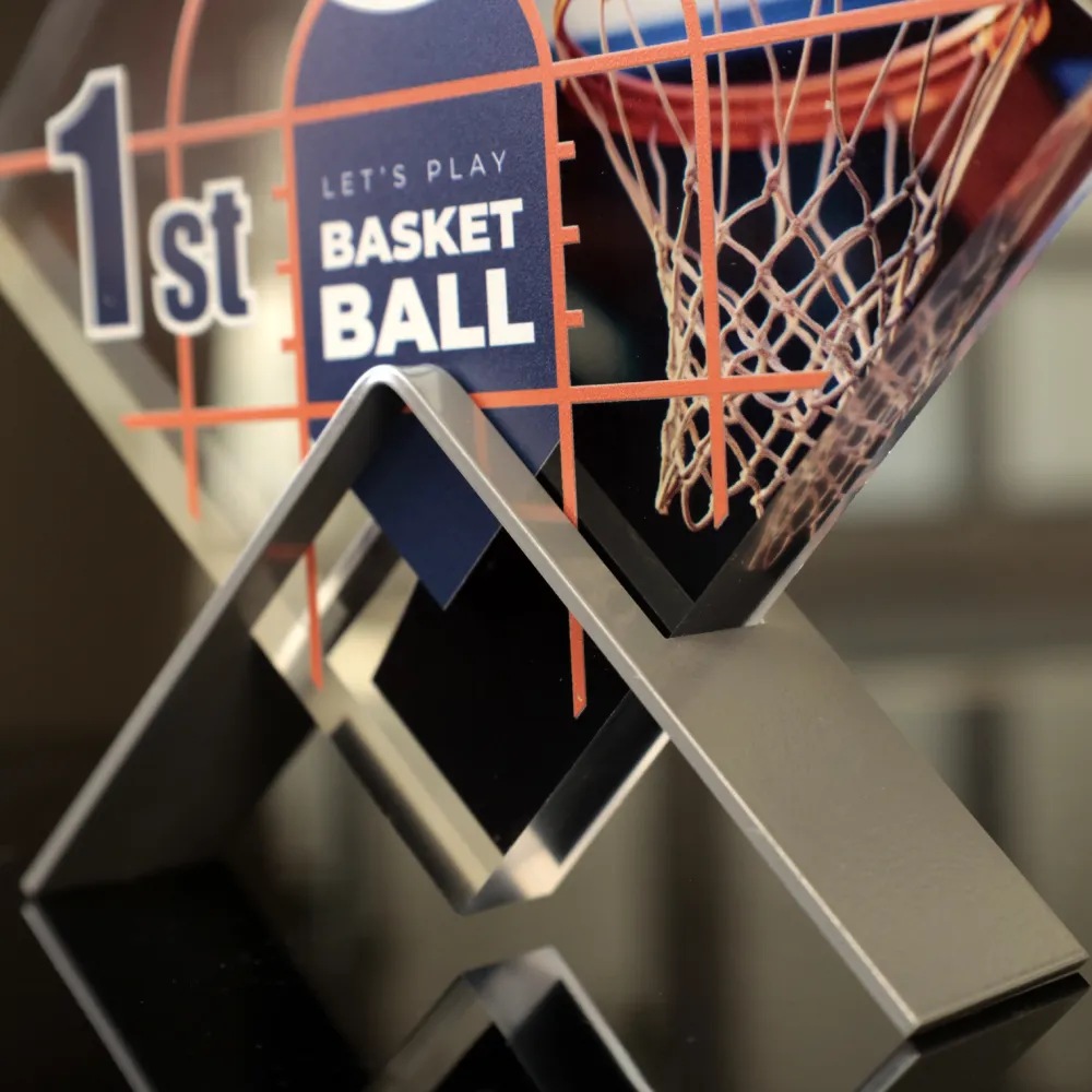 Acryl-Trophäe mit farbigem Aufdruck auf einem Metallsockel. Ihre moderne Form passt perfekt zu sportlichen Veranstaltungen.