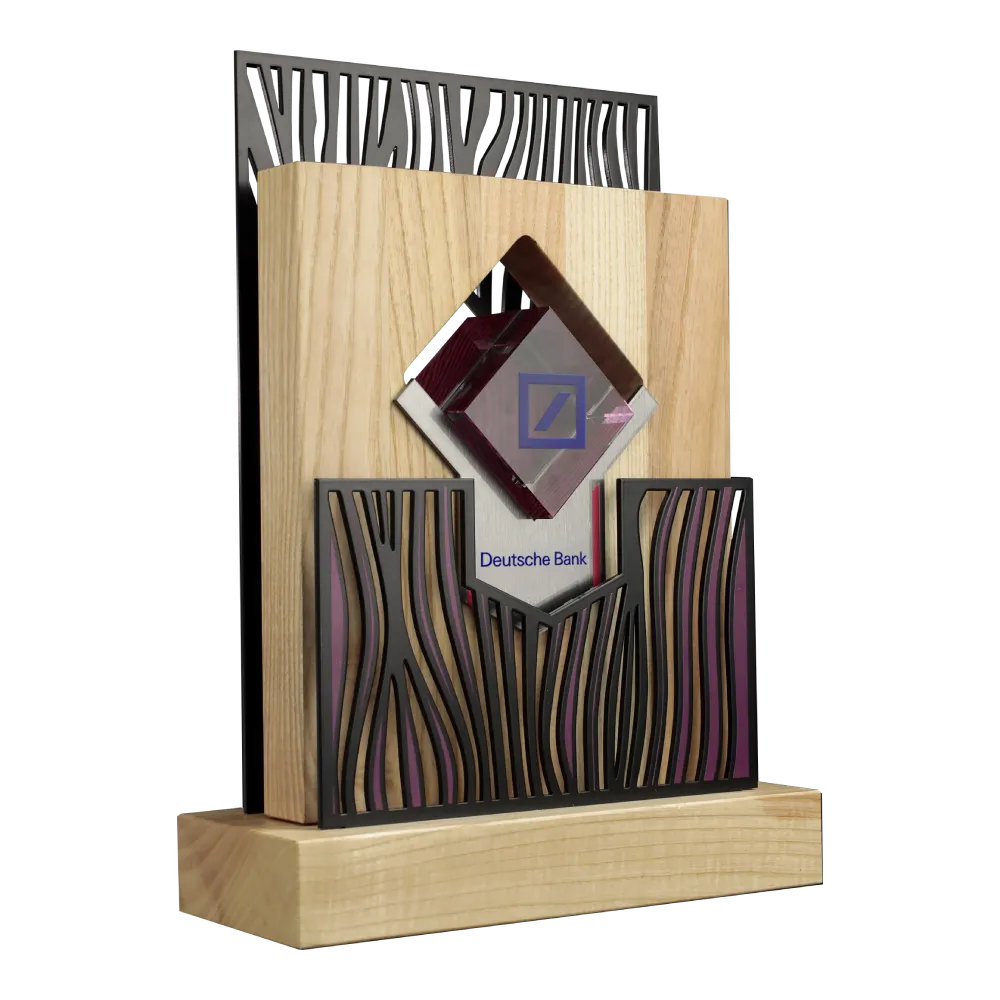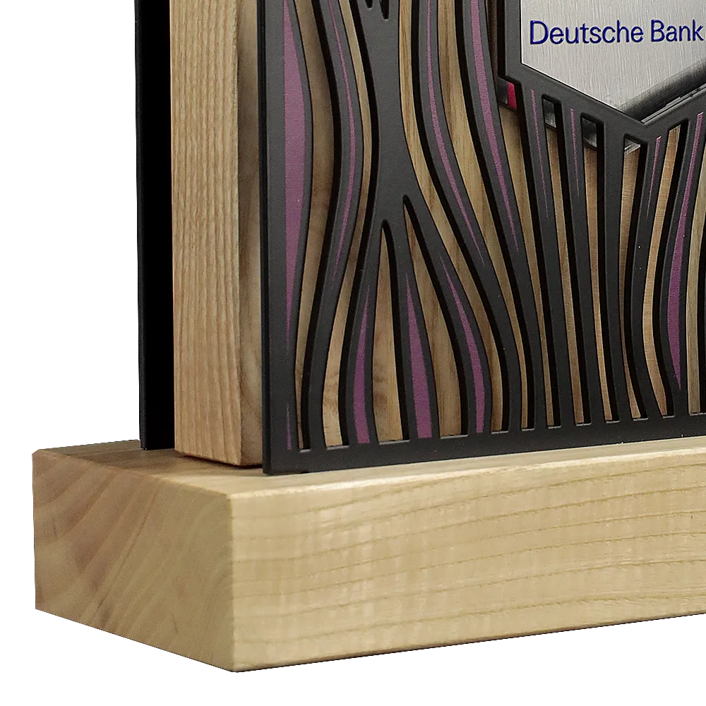 Diese exklusive Trophäe für die Deutsche Bank besticht durch ihr modernes Zusammenspiel von Materialien wie Holz, Metall und Glas. Die klaren Linien, kombiniert mit organisch wirkenden Ausschnitten, verleihen der Auszeichnung einen eleganten und zugleich innovativen Charakter. Im Zentrum steht das Logo der Deutschen Bank, eingebettet in eine geometrisch präzise Komposition mit architektonischem Flair.
