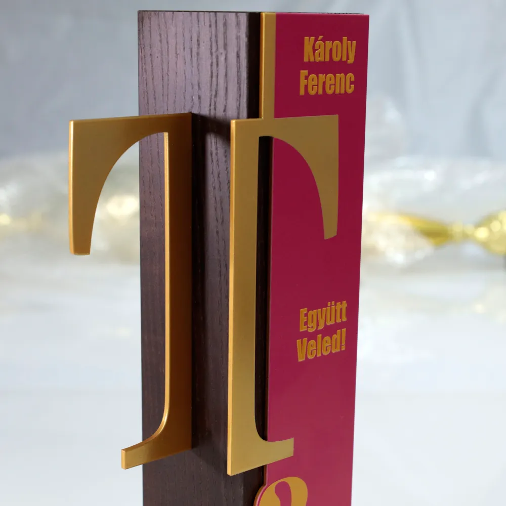 Eine moderne und prestigeträchtige Trophäe, die aus einer Kombination von Holz und Metall gefertigt ist, speziell für T-Mobile Magyarország entworfen. Sie zeichnet sich durch ein minimalistisches und gleichzeitig elegantes Design aus, das ihren einzigartigen Charakter betont.