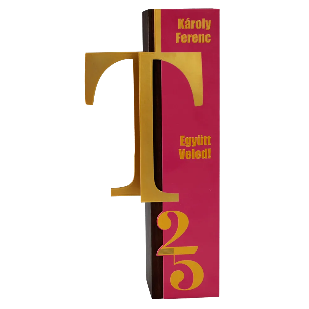 T-Mobile Magyarország, Teil der Deutschen Telekom Gruppe, spielt seit einem Vierteljahrhundert eine Schlüsselrolle in der Entwicklung der digitalen Kommunikation in Ungarn. Das Unternehmen war über viele Jahre hinweg ein Pionier bei der Einführung neuer Technologien und ein verlässlicher Partner im Alltag von Millionen von Kunden. Der auf der Trophäe sichtbare Slogan „Együtt veled!“ („Gemeinsam mit Dir!“) betont den beziehungsorientierten Charakter der Marke – nah an den Menschen und ihren Bedürfnissen. Diese Auszeichnung ist nicht nur ein Geschenk für Mitarbeitende oder Partner – sie ist ein Symbol für gemeinsame Geschichte, Vertrauen und zukünftiges Wachstum. Elegant, modern, bedeutungsvoll – diese Trophäe verkörpert den Geist eines Jubiläums, das nicht nur die Vergangenheit, sondern vor allem die Zukunft feiert.
