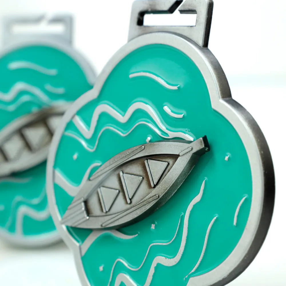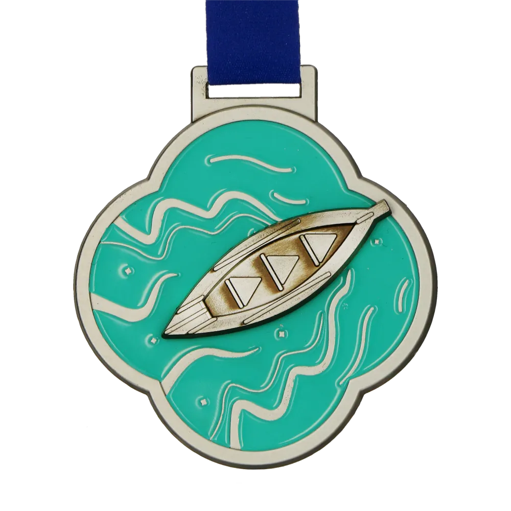 Diese Medaille wurde speziell für Kanu-Events entworfen und ist ein echtes Highlight für Liebhaber von Wassersport und detailverliebtem Design. Die Form ist unregelmäßig und fließend – inspiriert von der Kontur eines Sees – und verleiht der Auszeichnung eine einzigartige Optik, die sich deutlich von klassischen Medaillen abhebt. Die Oberfläche ist sorgfältig mit Emaille in Blau- und Türkistönen veredelt und erinnert an die ruhige Wasseroberfläche eines Sees. Sanfte Wellen unter der transparenten Beschichtung verstärken zusätzlich die Tiefe und Dynamik. Im Zentrum der Medaille befindet sich ein bewegliches, interaktives Element – ein Miniatur-Kajak, das sich über die „Seefläche“ schieben lässt. Dieses besondere Detail zieht nicht nur alle Blicke auf sich, sondern macht die Medaille zu einem unvergesslichen Andenken. Eine breite, intensiv blaue Schleife rundet das Design ab und harmoniert perfekt mit der Farbgebung der Medaille. Diese Auszeichnung steht nicht nur für die Teilnahme, sondern ist auch ein stilvolles Symbol für das Abenteuer auf dem Wasser. Sie eignet sich ideal als Preis bei Kanu-Wettkämpfen, Teambuilding-Fahrten oder Freizeitveranstaltungen am Wasser. Ebenso kann sie ein originelles Souvenir bei Wassersport-Festivals oder lokalen Outdoor-Events in der Nähe von Seen und Flüssen sein.