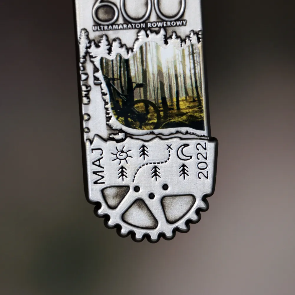 Die Medaille des UŁAN 600 Fahrrad-Ultramarathons ist ein einzigartiges Erinnerungsstück, das technische und naturverbundene Elemente miteinander vereint. Sie ist rechteckig geformt, mit einer charakteristischen Aussparung im unteren Bereich, die einem Fahrradritzel nachempfunden ist – ein klares Symbol für den Radsportcharakter der Veranstaltung. Im Zentrum der Medaille befindet sich ein farbenfroher Druck, der einen Radfahrer auf einem Waldweg zeigt – ein Bild, das die Atmosphäre des Wettkampfs inmitten unberührter Natur lebendig werden lässt. Oben auf der Medaille ist deutlich die Aufschrift „UŁAN 600“ zu lesen, direkt darunter in kleineren Buchstaben: „Ultramaraton Rowerowy“, was bedeutet „Radultramarathon“. An den Seiten befinden sich vertikale Beschriftungen: links „MAJ“, rechts „2022“, die den Zeitpunkt des Events kennzeichnen. Der untere Teil ist mit Symbolen wie Sonne, Mond, Sternen und Bäumen verziert – sie stehen für den 24-Stunden-Charakter des Rennens und die enge Verbindung zur Natur. Die Medaille hängt an einem breiten, grünen Band, das das Waldmotiv perfekt abrundet. Das gesamte Design wurde sorgfältig durchdacht, um eine ästhetische und harmonische Komposition zu schaffen.