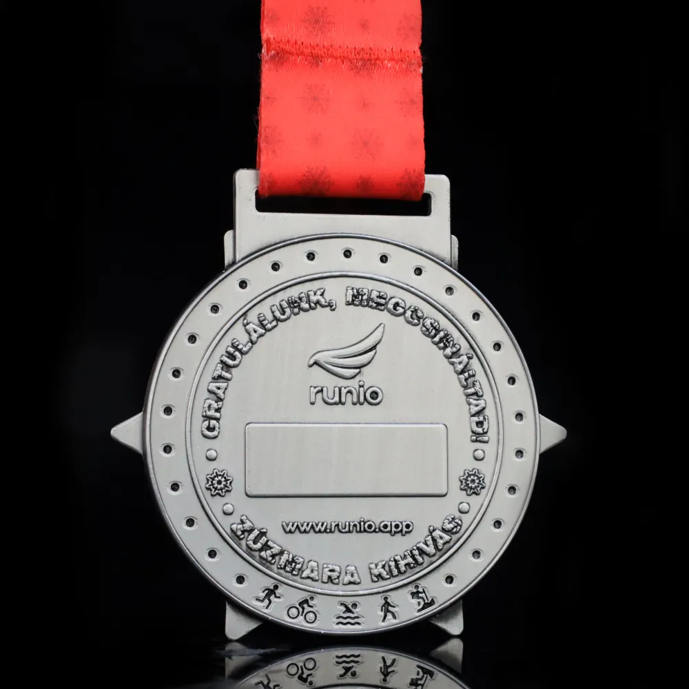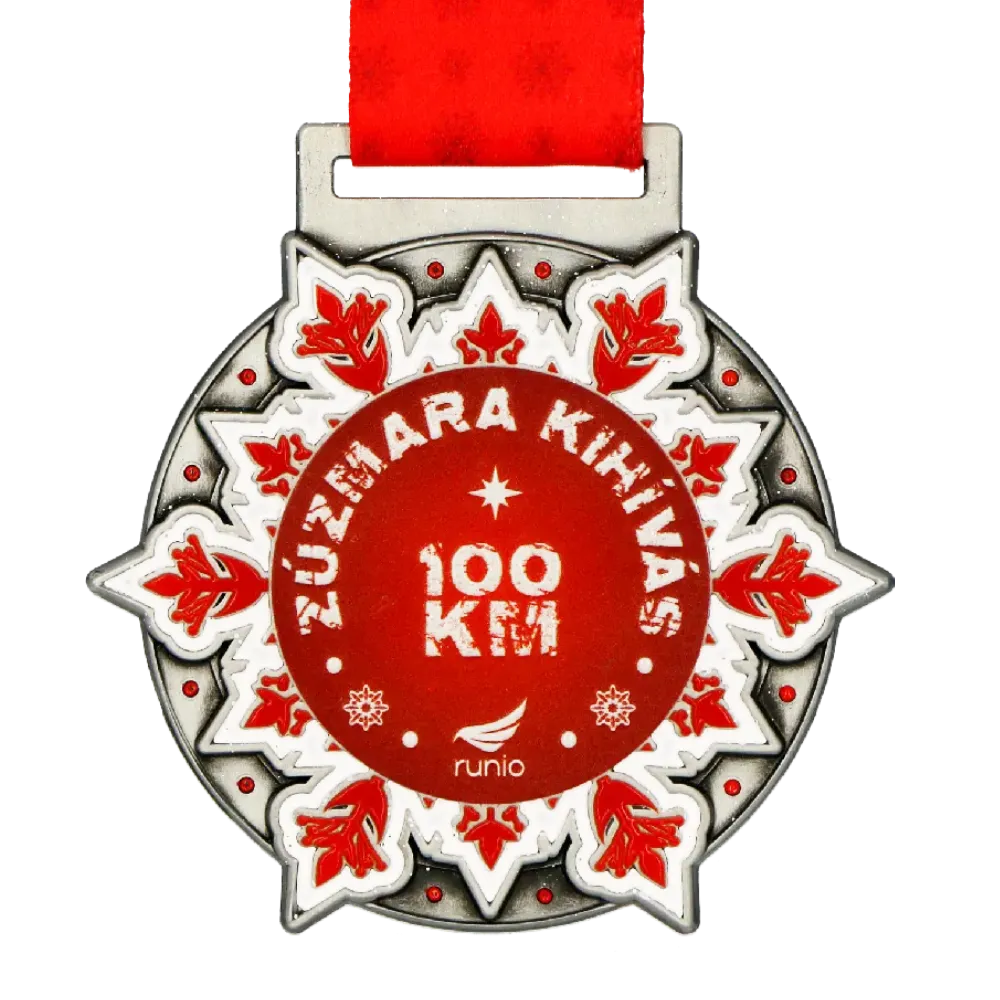 Diese Medaille wurde für die Zúzmara Kihívás 100 KM-Herausforderung verliehen, ein Ausdauerlauf bei winterlichen Bedingungen. Das auffällige Schneeflocken-Design in Rot und Weiß symbolisiert Kälte, Ausdauer und sportlichen Ehrgeiz. Die zentrale Aufschrift mit der Distanz von 100 Kilometern unterstreicht die beeindruckende Leistung der Teilnehmenden.