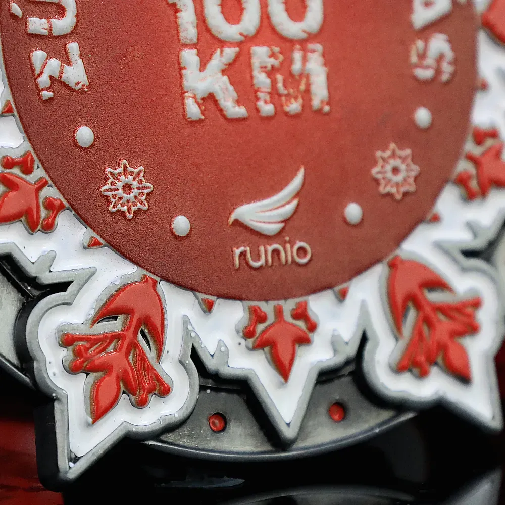 Die beidseitige Medaille beeindruckt mit farbenfrohen Elementen, die sich haptisch erfühlen lassen. Im Zentrum – in Form einer Schneeflocke – sind der Eventname, die Distanz sowie der Name der App deutlich hervorgehoben. Auf der Medaillenoberfläche befindet sich sowohl ein farbiger Druck als auch feine Details, die mit Emaille veredelt wurden.