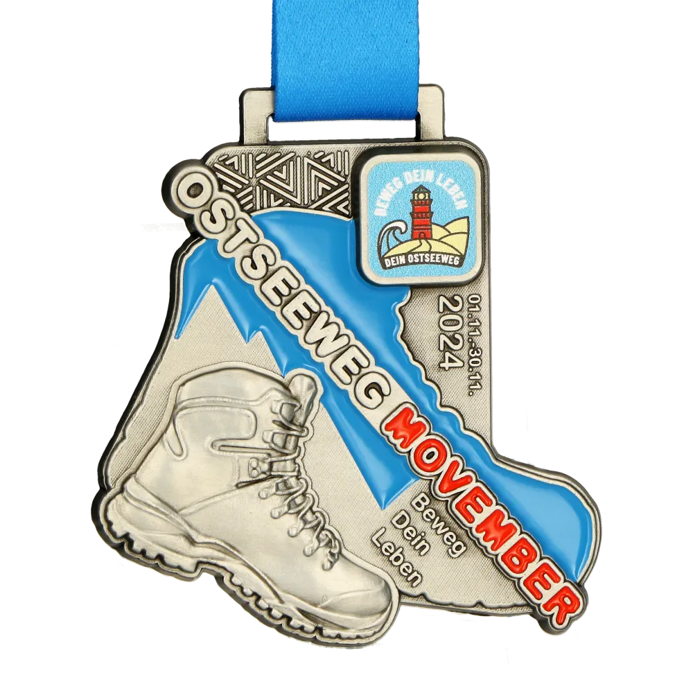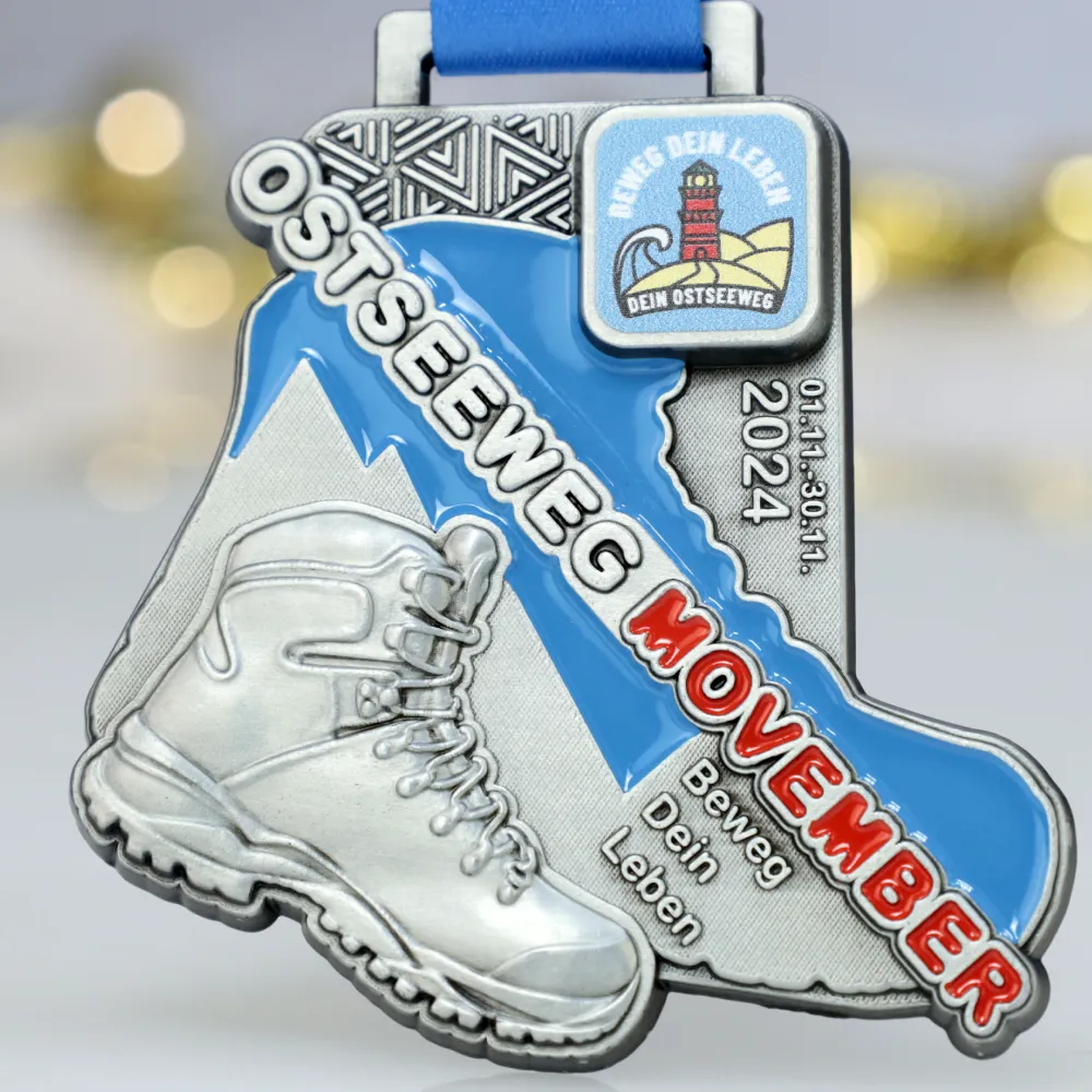 Diese Medaille wurde für den Ostseeweg Movember 2024 gestaltet, eine Aktion zur Förderung von Bewegung und Gesundheit. Das Design zeigt einen Wanderstiefel auf blauem Hintergrund mit auffälligem „Movember“-Schriftzug. Mit dem Motto „Beweg Dein Leben“ wird zur aktiven Teilnahme und Unterstützung der Männergesundheit aufgerufen.