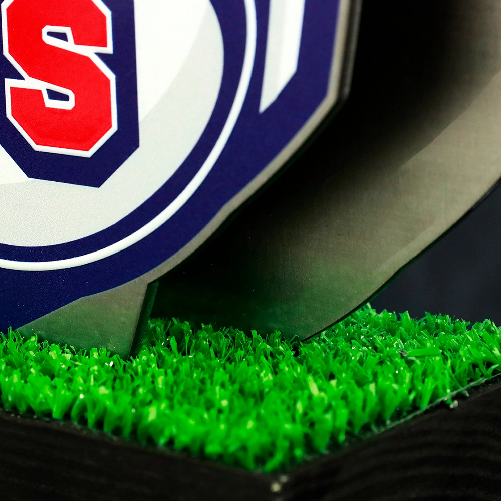 Elegante Trophäe mit einem Element aus Kunstrasen, montiert auf einem Holzsockel. Sie besteht aus zwei Metallplatten, die mit einem farbenfrohen UV-Druck verziert sind.