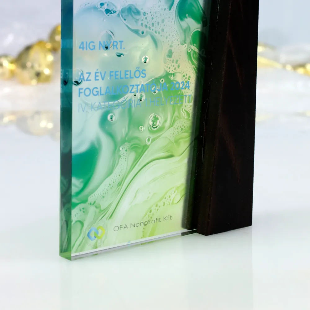 Die Trophäe hat eine klare, moderne Form, die auf dem Zusammenspiel zweier Materialien basiert, die nebeneinander auf gleicher Höhe angeordnet sind. Auf der linken Seite befindet sich ein Panel aus transparentem Acrylglas, das mit einem präzisen UV-Druck in Blau- und Grüntönen verziert ist – das Muster erinnert an sanfte Wasserwellen und verleiht der Komposition Leichtigkeit und Dynamik. Auf der rechten Seite steht ein massiver Block aus dunkel eingefärbtem Holz mit edler, tiefschwarzer Oberfläche. Beide Elemente – Acryl und Holz – sind exakt gleich hoch und schließen nahtlos aneinander an, wodurch eine harmonische und kontrastreiche Einheit entsteht.