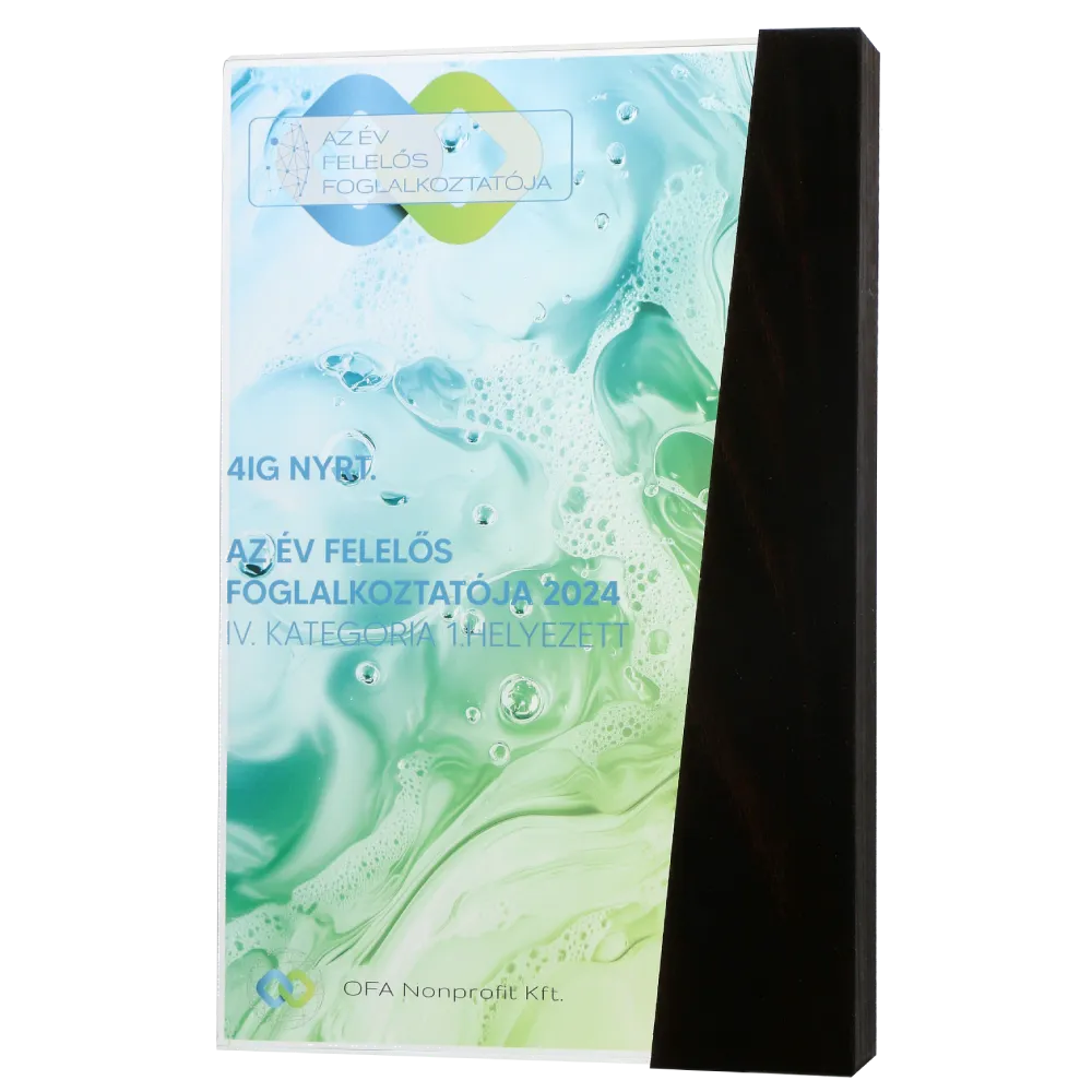 Eine elegante Business-Auszeichnung, die für die Gewinner des Wettbewerbs „Az Év Felelős Foglalkoztatója 2024” entworfen wurde, die für ein verantwortungsbewusstes Beschäftigungsverhältnis verliehen wird.