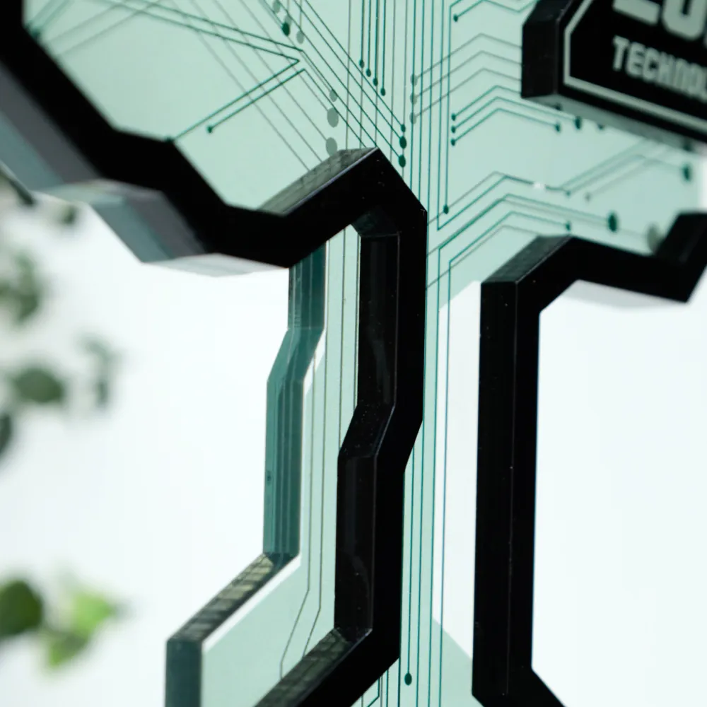 Diese Trophäe vereint auf originelle Weise Naturmotive mit einer technologisch geprägten Ästhetik. Ihre Form erinnert an einen Baum – schlanke, geometrische Äste streben nach oben und bilden eine dynamische Struktur. Gefertigt aus einer Kombination von transparentem Glas und Acryl, besticht die Trophäe durch Leichtigkeit und visuelle Tiefe. Die klaren Flächen sind mit einem UV-Druck verziert, der feine Linien zeigt, inspiriert von Schaltkreisen und technischen Zeichnungen – ein dezenter, aber markanter Verweis auf die Welt moderner Technologien. Das Ganze ruht auf einem eleganten schwarzen Sockel, der einen starken Kontrast zur transparenten Form bietet und den prestigeträchtigen Charakter der Trophäe unterstreicht. Symbolisch steht die Trophäe für die Harmonie zwischen Natur und Fortschritt – der Baum als Zeichen für Leben, Wachstum und Gleichgewicht, die technologischen Linien als Metapher für Innovation, Digitalisierung und zukunftsweisende Lösungen. Eine ideale Auszeichnung für Unternehmen und Persönlichkeiten, die sich im Bereich Nachhaltigkeit, Innovation oder moderner Technologien engagieren.