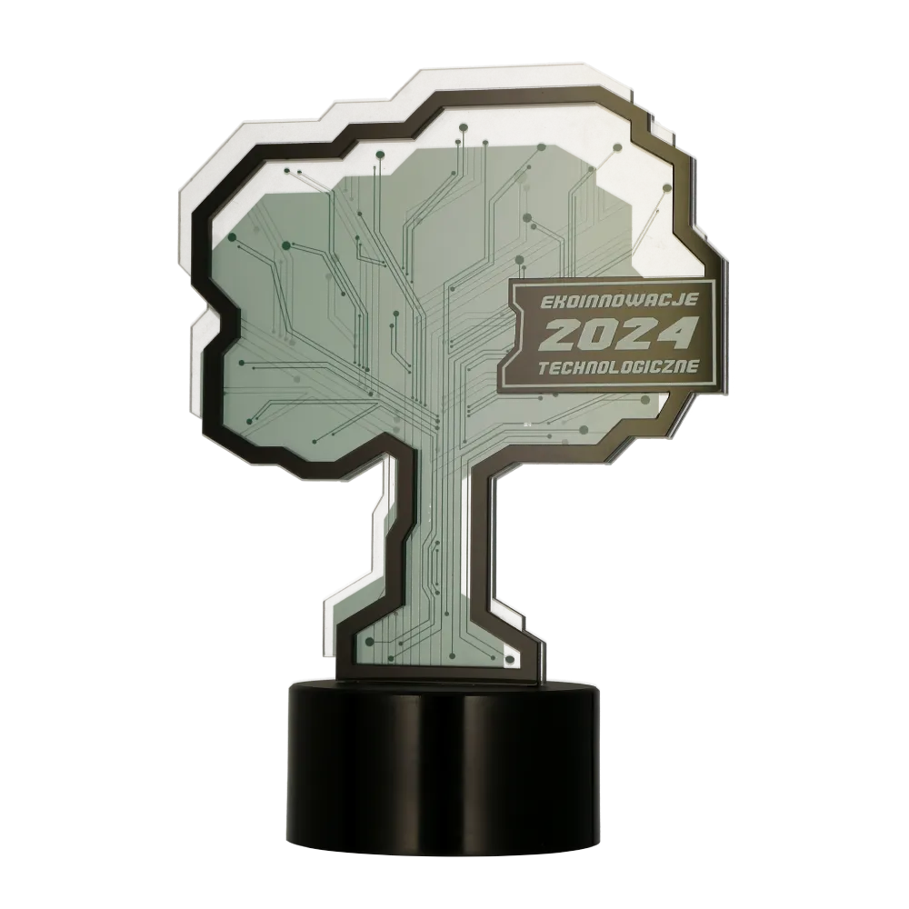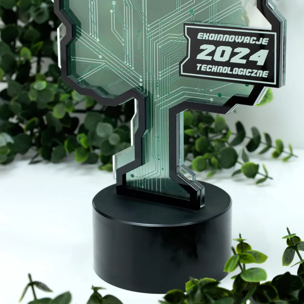 Eine moderne Statuette in Form eines stilisierten Baumes, die die Verbindung von Technologie und Ökologie symbolisiert. Gefertigt aus hochwertigen Materialien, vereint sie futuristisches Design mit einer klaren umweltfreundlichen Botschaft.