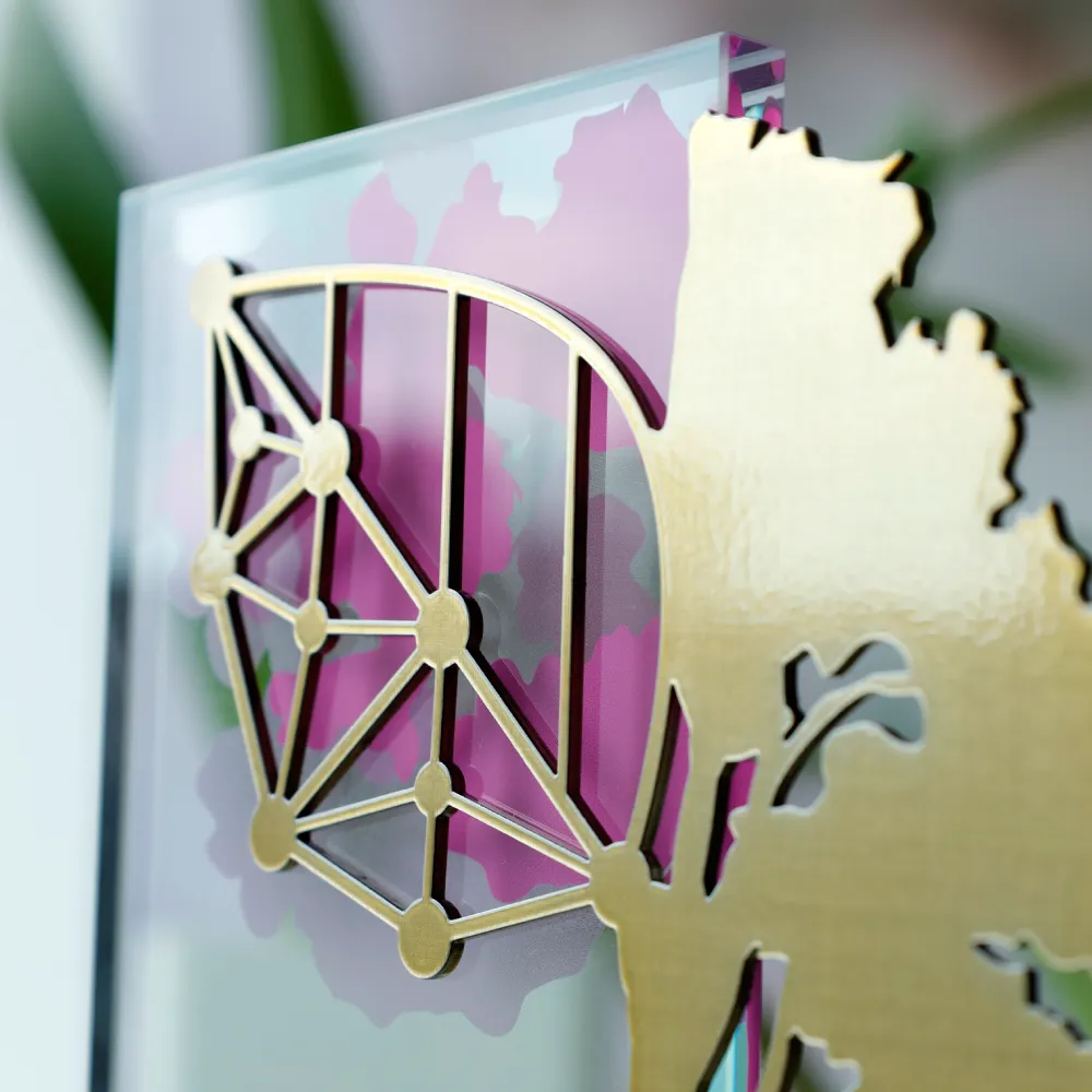 Eine elegante Glasstatue, bereichert mit einem präzise lasergeschnittenen Metallelement, fügte sich perfekt in die Atmosphäre der Unternehmensfeierlichkeiten ein. Solche Auszeichnungen wurden den Mitarbeitern der Firma Wellu verliehen.