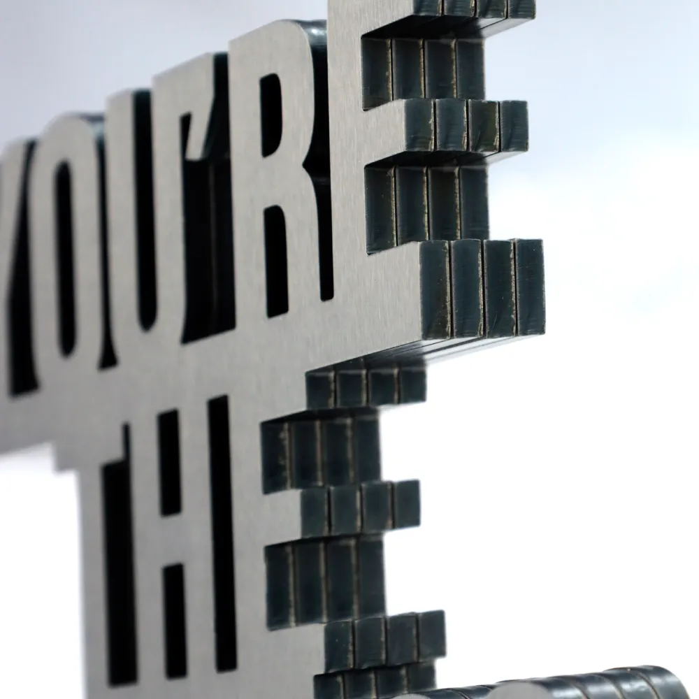 Die Statue besteht aus schichtweise angeordnetem Metall, das einen räumlichen Effekt erzeugt. Der lasergravierte Schriftzug verleiht dem Gesamtwerk einen eleganten und industriellen Charakter. Eine perfekte Auszeichnung in der Geschäftswelt.
