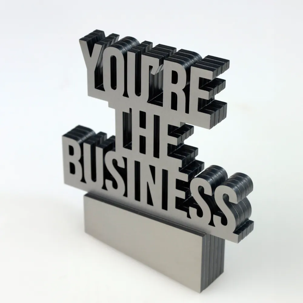 Diese außergewöhnliche Statuette ist eine moderne Auszeichnung, die perfekt zur Ästhetik der heutigen Geschäftswelt passt. Komplett aus Metall gefertigt, besteht sie aus mehreren präzise übereinandergeschichteten Elementen, die ihr Tiefe und eine markante räumliche Wirkung verleihen. Im Mittelpunkt steht der lasergravierte Schriftzug „You’re the business“ – ein klarer, kraftvoller Ausdruck von Anerkennung für Professionalität, Engagement und besonderen Einsatz für den Erfolg eines Unternehmens oder Projekts.