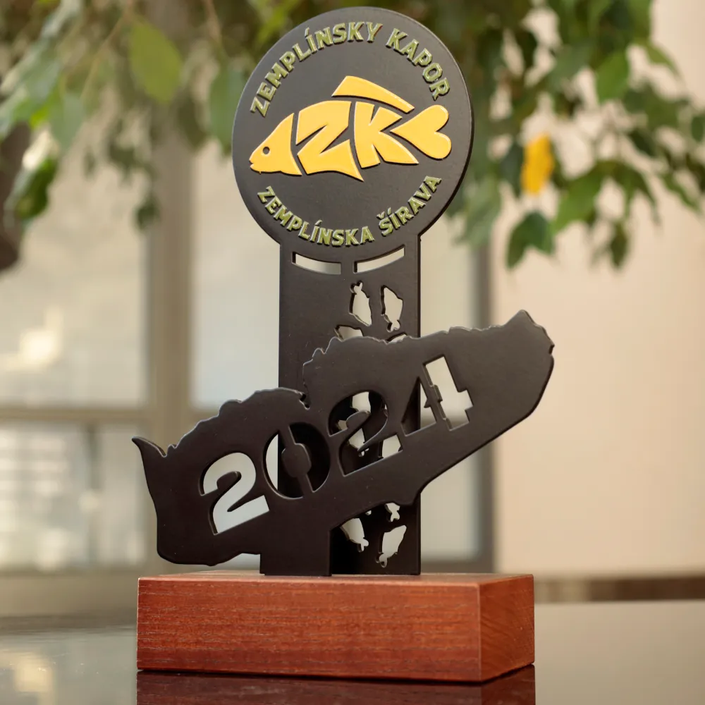 Die exklusive Angler-Trophäe „Zemplínsky Kapor 2024“ wurde eigens für diesen renommierten internationalen Angelwettbewerb entworfen, der am malerischen Zemplínska Šírava stattfand. Ihr durchdachtes Design spiegelt den Geist des Wettbewerbs perfekt wider und vereint moderne Technik mit symbolischen Elementen des Ortes und des Themas. Gefertigt aus Metall und mit präzisem Laserschnitt bearbeitet, überzeugt die Trophäe mit kunstvollen, durchbrochenen Details. Sie ist auf einem eleganten Holzsockel montiert, der einen spannenden Kontrast zum Metall bildet und den exklusiven Charakter der Auszeichnung unterstreicht. Die Trophäe besteht aus zwei präzise gestalteten Elementen: Die vordere Platte zeigt die Umrisse des Zemplínska Šírava – dem Herzstück des Wettbewerbs – und trägt zentral die plastisch herausgearbeitete Jahreszahl „2024“. Ein dezentes, aber prägnantes Detail, das auf die aktuelle Ausgabe des Events verweist. Die Rückseite zeigt das offizielle Logo des Wettbewerbs, ergänzt durch feine, durchbrochene Karpfenmotive – ein stimmiges gestalterisches Element, das den Bezug zum Karpfenangeln betont.