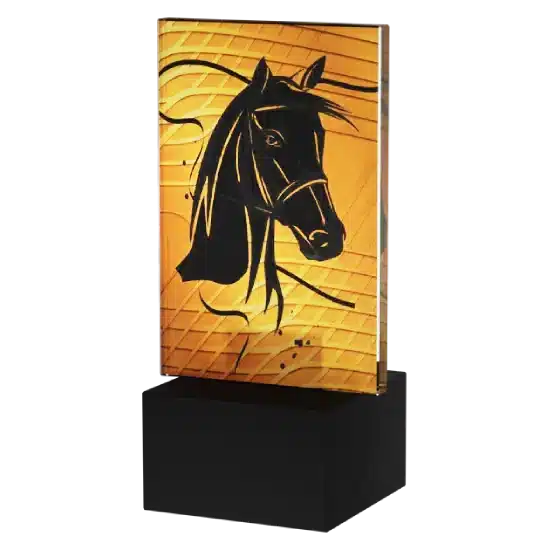 Glas-Trophäen stehen seit jeher für Klasse und Qualität – und das Modell Reitsport bestätigt diesen Ruf mit jeder Facette. Sie besteht aus robustem, dickem Glas in rechteckiger Form. Im Mittelpunkt steht ein schwarzes Pferdeprofil vor einem edlen gold-orangefarbenen Hintergrund.