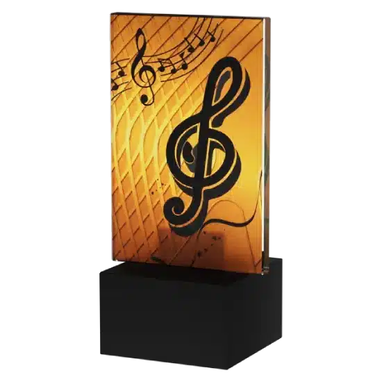 Die Trophäe besteht aus hochwertigem Glas in rechteckiger Form, was ihr einen modernen und zugleich eleganten Charakter verleiht. Auf der Vorderseite befindet sich eine stilvolle Grafik mit einem Violinschlüssel – ein weltweit erkennbares Symbol, das unmittelbar mit Musik, ihrer Schönheit und Ausdruckskraft assoziiert wird. Ergänzt wird das Design durch Noten auf einer Notenlinie, die die musikalische Botschaft noch verstärken.