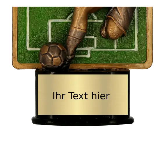 Die Harz Trophäe für Fußballturniere kann mit einer goldenen oder silbernen Gravurplatte nach Wunsch versehen werden. Darauf können wir den Namen des Turniers, den Namen des Gewinners, den Vereinsnamen, das Datum oder eine persönliche Widmung eingravieren. Personalisierte Fußballpreise erhalten so einen ganz besonderen Charakter und werden zu bleibenden Erinnerungen.