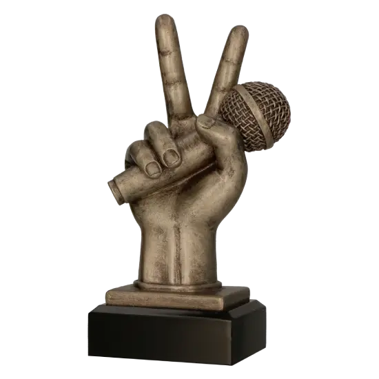 Die Trophäe Hand mit Mikrofon ist ein ausgezeichnetes Symbol für den Erfolg in der Welt der Musik, der öffentlichen Reden und der Bühnenkunst. Die Figur stellt eine Hand dar, die ein Mikrofon hält, mit erhobenen Fingern in einem Gestus (der das „V“ bildet), was sie zur idealen Auszeichnung für Sänger, Redner und Bühnenkünstler macht.
