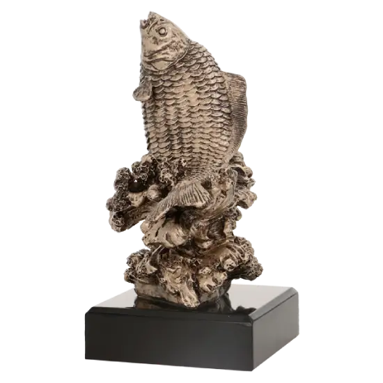 Die Karpfenfigur wurde aus hochwertigem Harz gegossen. Die metallische Oberfläche verleiht ihr Eleganz, während subtile Schattierungen den dreidimensionalen Effekt des sich bewegenden Fisches betonen. Durch die präzise Ausführung und die sorgfältig nachgebildeten Details wie die Struktur der Schuppen, Flossen und Wellen ist diese Trophäe eine ausgezeichnete Möglichkeit, Angelfreunde sowie die Gewinner von Angelwettbewerben zu ehren.