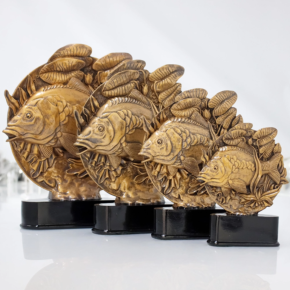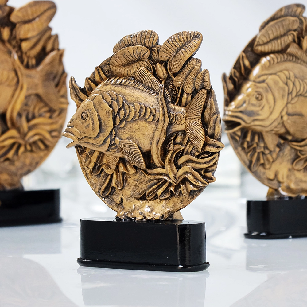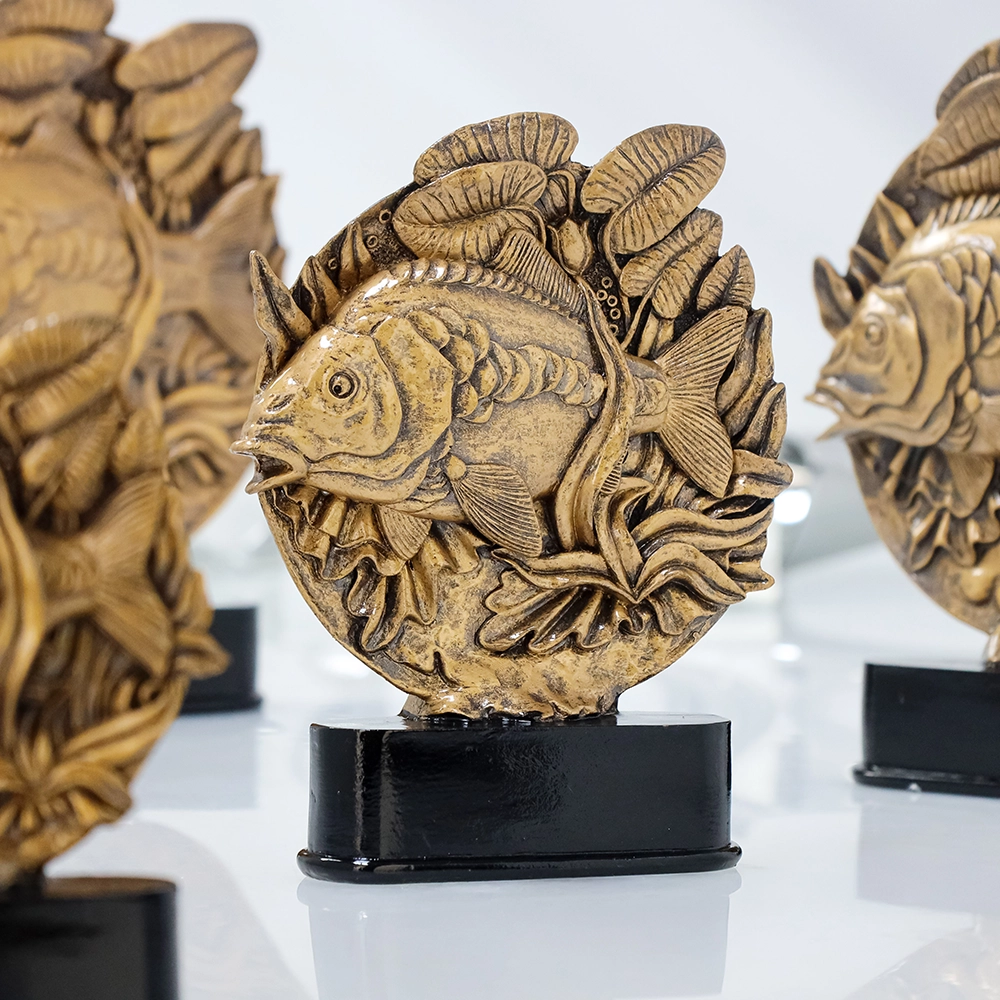 Jedes Detail dieser Karpfen-Trophäe wurde sorgfältig entworfen und mit höchster Präzision gegossen. Die realistisch nachgebildeten Formen des Karpfens und der Wasserpflanzen schaffen ein äußerst lebensechtes Bild der Unterwasserwelt. Das hochwertige Harz, aus dem die Trophäe gegossen wurde, sorgt nicht nur für Langlebigkeit, sondern auch für eine hervorragende Detailtreue. Das metallisch-bronzene Finish verleiht ihr einen edlen, eleganten Charakter.
