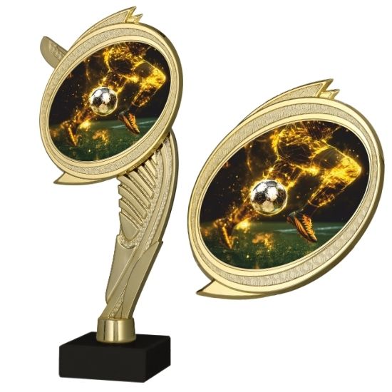 Die Trophäe besteht aus hochwertigem Kunststoff in Goldfarbe, was ihr ein ästhetisches Erscheinungsbild und Langlebigkeit verleiht. Das zentrale Element ist eine Platte mit einer Grafik, die einen Fußballspieler zeigt, der neben dem Ball läuft. Dieses Motiv symbolisiert Geschwindigkeit, Ballkontrolle und entschlossenes Handeln.
