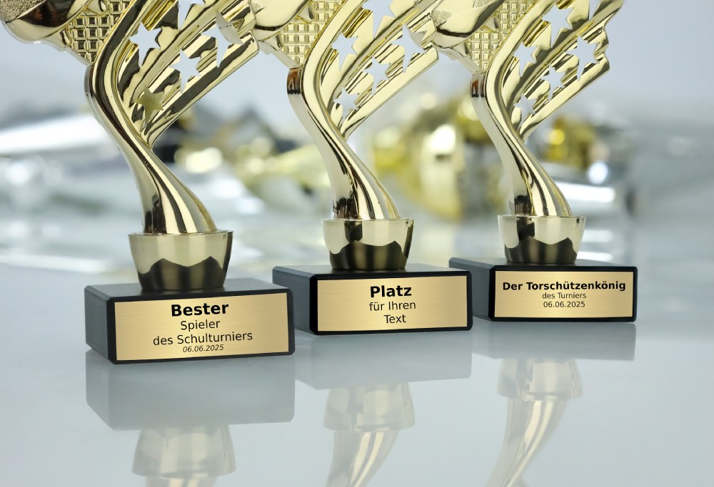 Die schwarze Basis der Trophäe bietet Platz für eine Gravurplatte mit individueller Widmung. Sie können den Namen des Teilnehmers, den Namen des Wettbewerbs, das Datum der Veranstaltung oder eine kurze motivierende Botschaft hinzufügen. Dadurch wird jede Trophäe zu einem einzigartigen Preis, den die Teilnehmer gerne als Erinnerung an einen besonderen Moment aufbewahren. Die Personalisierung betont zudem den professionellen Anspruch des Veranstalters und die Liebe zum Detail.
