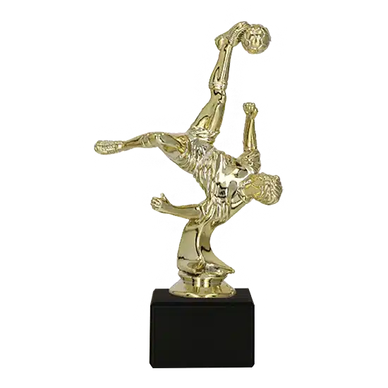 Die Trophäe besteht aus hochwertigem Kunststoff und ist mit einer glänzenden goldenen Oberfläche veredelt, die ihr ein elegantes und prestigeträchtiges Aussehen verleiht. Sie stellt die Figur eines Fußballspielers beim Fallrückzieher dar – eine Szene, die an die legendären Aktionen von Spielern wie Klaus Fischer, Cristiano Ronaldo oder Wayne Rooney erinnert. Ihre ikonischen Tore mit akrobatischen Einlagen sind unvergessen – genau wie diese Trophäe, die den Fußball in seiner dynamischsten und beeindruckendsten Form symbolisiert.