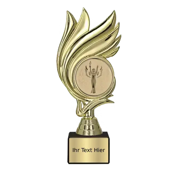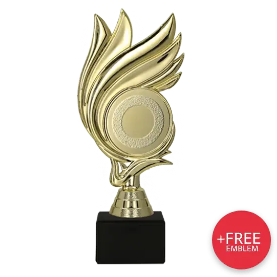 Das Design vereint Dynamik und Harmonie – flammenartige Elemente, die sich kraftvoll nach oben strecken, verleihen der Trophäe eine besondere Energie. Im Zentrum befindet sich ein rundes Emblemfeld – ein echter Blickfang und ideal zur Personalisierung.