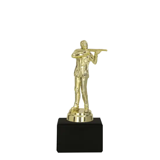 Die Figur zeigt einen Jäger in typischer Jagdbekleidung, der konzentriert mit dem Gewehr zielt, bereit für den perfekten Schuss. Jeder Aspekt – von den fein gearbeiteten Falten in der Kleidung bis hin zur dynamischen Körperhaltung – wurde sorgfältig gestaltet, um die Jagdtradition authentisch zu repräsentieren. Der schwarze Sockel bietet eine stabile Basis und betont zusätzlich den goldenen Glanz der Trophäe.