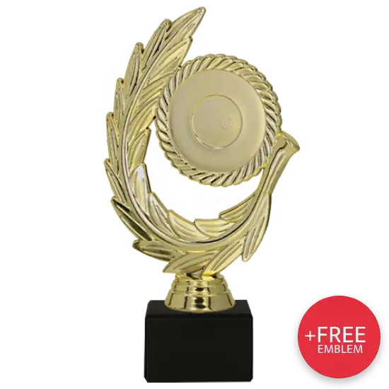 Die Trophäe besteht aus hochwertigem Kunststoff und ist mit einer glänzenden goldfarbenen Beschichtung versehen – eine Farbe, die seit jeher mit Sieg und Erfolg assoziiert wird. Die Form zeigt einen Zweig des Lorbeerkranzes – ein zeitloses Symbol für Ruhm und Triumph. In der Mitte befindet sich ein runder Medaillon-Einsatz, der Platz für ein individuelles Emblem bietet – sei es das Logo eines Unternehmens, ein Veranstaltungszeichen oder ein eigenes Design. Alternativ kann auch eines unserer vorgefertigten Motive gewählt werden.