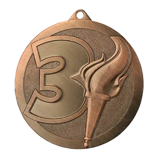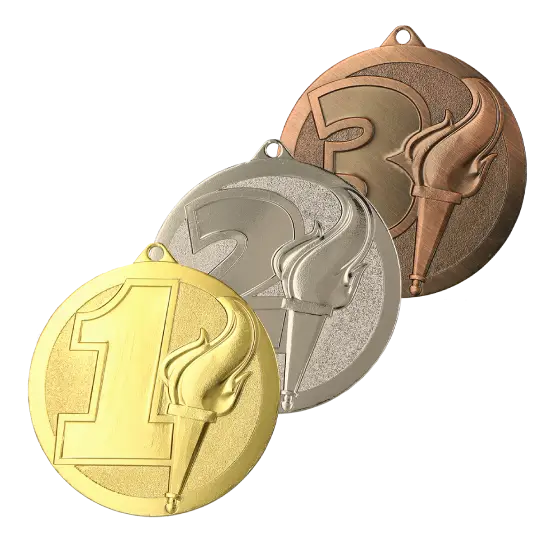 Auf der Vorderseite der Medaille prangt eine brennende Fackel – ein universelles Symbol für Stärke, Leidenschaft und Zielstrebigkeit. Je nach Platzierung ist die Medaille für den Sieg in drei klassischen Varianten erhältlich: Gold mit der Zahl 1, Silber mit der Zahl 2 und Bronze mit der Zahl 3. Die präzise Verarbeitung und das massive Metall sorgen dafür, dass die Medaille auch nach vielen Jahren beeindruckend aussieht.