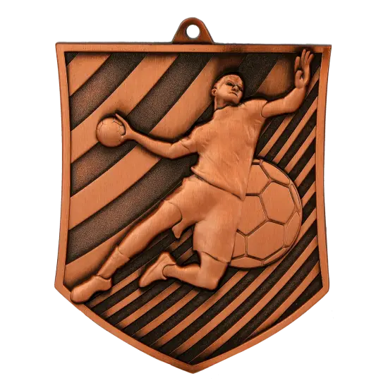 Auf der Vorderseite der Medaille ist ein Handballspieler im Wurf dargestellt – eingefangen in einem Moment voller Emotionen und sportlicher Leidenschaft. Im Hintergrund ist zudem ein Handball zu sehen, der den Charakter der Disziplin betont. Jedes Detail – von der Körperhaltung des Spielers bis zu den Linien des Balls – wurde mit höchster Präzision ausgearbeitet. Die wappenähnliche Form verleiht der Medaille Eleganz und macht sie zur perfekten Wahl für Veranstalter bedeutender Handball-Events.