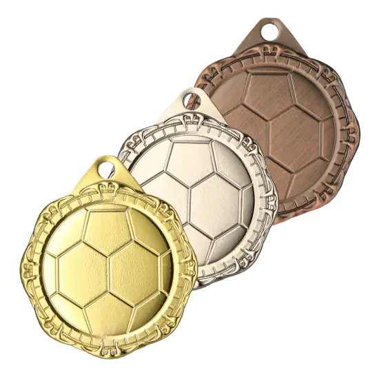 Das Design dieser Medaille wurde speziell für echte Fußballfans entworfen. Das Zentrum bildet ein detailreich gestalteter Fußball mit den typischen sechseckigen Panels, die der Medaille ein authentisches Aussehen verleihen. Ein besonderes Highlight ist der wellenförmige, dekorative Rand, der dem Ganzen Dynamik und Eleganz gibt. Die Verfügbarkeit in drei Farbvarianten – Gold, Silber und Bronze – ermöglicht eine perfekte Anpassung an jede Art von Auszeichnung.