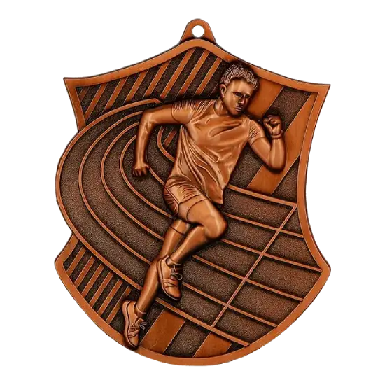 Die dynamische Läufer-Silhouette vor einer Laufbahn verleiht der Medaille Ausdruck von Bewegung, Energie und sportlicher Leidenschaft. Die außergewöhnliche Schildform hebt sie deutlich von klassischen, runden Sportmedaillen ab und macht sie zu einem echten Blickfang.