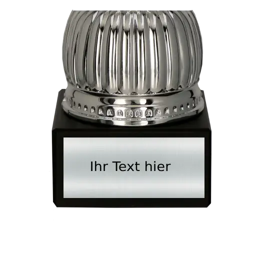 Der Pokalsockel aus hochwertigem Kunststoff ist aufwendig gestaltet. Die gesamte Konstruktion ruht auf einem stabilen, dunklen marmorierten Sockel mit glatter Oberfläche, der Eleganz und Standfestigkeit garantiert.