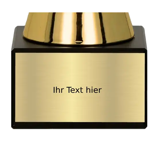 Getragen wird der Kelch von einem goldfarbenen Kunststofffuß, der trotz seiner schlanken Form äußerst stabil ist. Feine Details sorgen für ein stilvolles Erscheinungsbild. Die Basis des Pokals besteht aus echtem Marmor – einem natürlichen Material, das Stabilität und Langlebigkeit garantiert. Auf dieser Marmorbasis befindet sich Platz für eine Gravurplatte, die jede Auszeichnung zu einem persönlichen Erinnerungsstück macht.