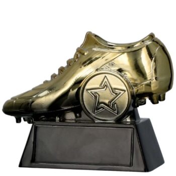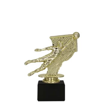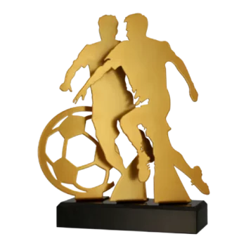 Der Pokal Fußballspielzug besteht aus langlebigem Kunststoff in edlem Goldton – dadurch ist er besonders leicht, wirkt aber gleichzeitig hochwertig und elegant. In der Mitte befindet sich ein Metalleinsatz mit dem Bild eines Fußballspielers in einem spektakulären Schussmoment vor flammendem Hintergrund, der die Energie und Begeisterung des Spiels symbolisiert.