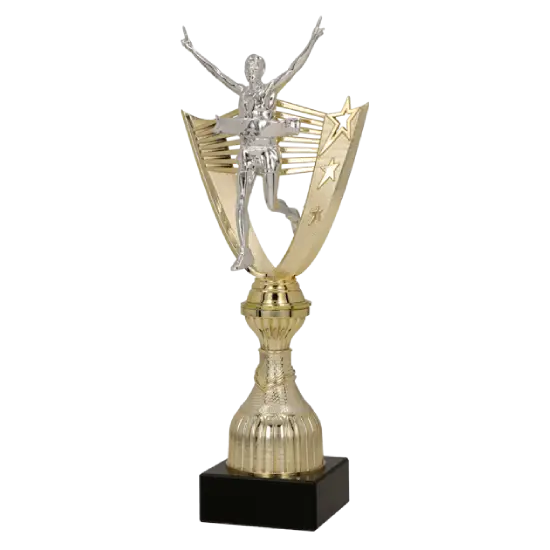Der Pokal 8304 wird aus robustem Kunststoff gefertigt, der Metall täuschend echt imitiert, dabei aber leicht und praktisch bleibt. Das auffälligste Detail ist die Figur des Läufers im Moment des Zieleinlaufs – mit hoch erhobenen Armen als Geste des Sieges. Die Figur erstrahlt in elegantem Silber, das einen edlen Kontrast zur goldenen Konstruktion bildet.