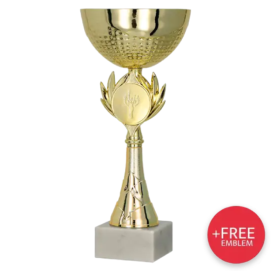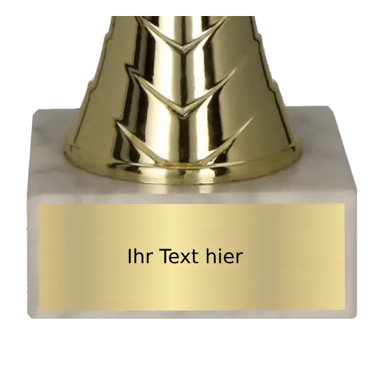 Pokal 8342 überzeugt durch seine hochwertige Verarbeitung. Er verfügt über einen goldfarbenen Metallkelch, dessen Oberfläche mit feinen Prägungen versehen ist. Diese verleihen der Trophäe Eleganz und lassen das Licht effektvoll reflektieren. Unter dem Kelch befindet sich ein schlanker Schaft aus Kunststoff, veredelt mit dekorativen Details. Sein zentrales Element ist die Fläche für ein Emblem, eingefasst von kunstvollen Zweigen in Form eines Lorbeerkranzes – dem zeitlosen Symbol für Erfolg und Ruhm. Stabilität bietet der helle Marmorsockel, dessen natürliche Struktur einen edlen Kontrast zur goldenen Oberseite bildet.