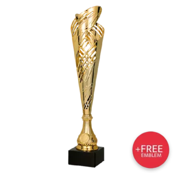 Pokal 8353 überzeugt durch modernes Design und den eleganten Kontrast der Farben. Gold steht für Triumph, Schwarz verleiht dem Pokal eine exklusive Tiefe. Die schlanke Form, die dekorativen Aussparungen, die Personalisierungsmöglichkeiten und der stabile Marmorsockel machen ihn zu einer idealen Auszeichnung für unterschiedlichste Anlässe.