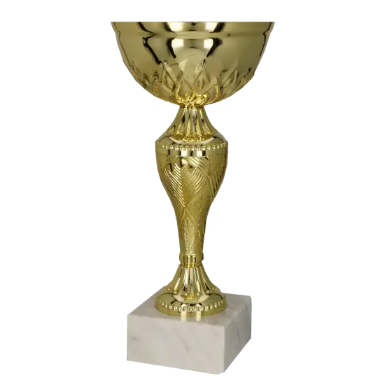 Pokal 8366 zeichnet sich durch einen goldenen Metallkelch mit glänzender Oberfläche aus, der mit feinen, kunstvollen Details veredelt ist. Jeder Aspekt wurde sorgfältig ausgearbeitet, um die Eleganz und den modernen Charakter der Trophäe zu betonen. Der Fuß mit origineller Form verleiht der gesamten Konstruktion einen besonderen Ausdruck.