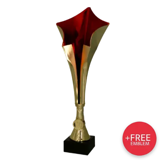 Pokal 8373 besteht aus langlebigem Kunststoff, der leicht ist und zugleich edles Metall imitiert. Die Außenseite in Gold reflektiert das Licht und erzeugt beeindruckende Glanzeffekte, während das Innere des Kelchs in kräftigem Rot einen kontrastreichen Akzent setzt.