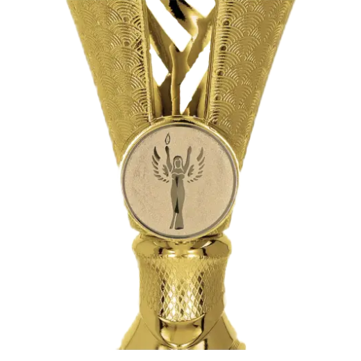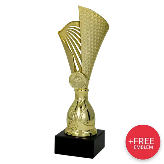 Der Pokal 9234 besticht durch modernen Stil. Die goldene Farbgebung unterstreicht die Bedeutung der Leistung, und die außergewöhnliche Kelchform sorgt für eine besonders eindrucksvolle Optik.