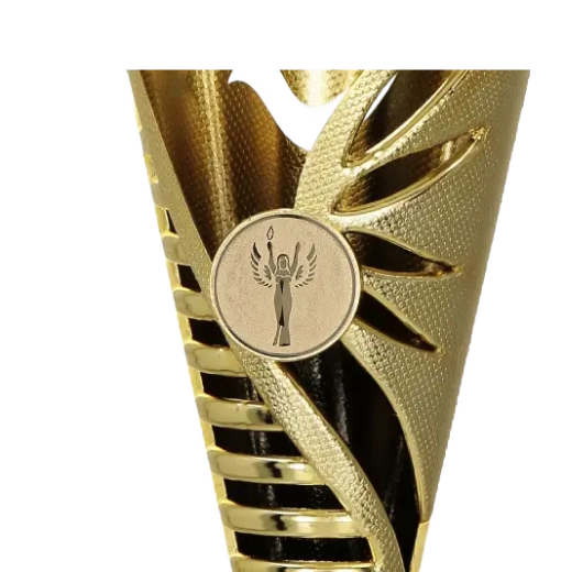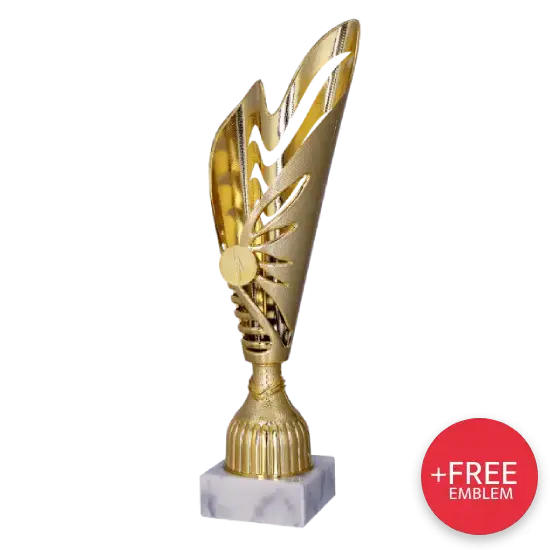 Der Pokal 9260 wird aus hochwertigem Kunststoff gefertigt, wodurch er gleichzeitig robust und leicht ist. Sein Highlight ist der offene Kelch in wellenförmigem Design, verziert mit kunstvollen Aussparungen. Diese außergewöhnliche Form zieht alle Blicke auf sich und hebt den Pokal von traditionellen Modellen ab. Die goldene Oberfläche betont Prestige und Eleganz und macht ihn zur perfekten Wahl selbst für hochkarätige Events.