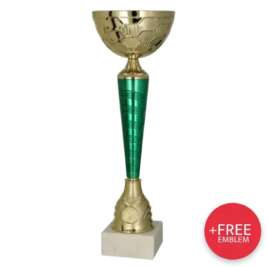 Modell 9287 besticht durch einen metallischen Goldkelch und goldfarbenen Sockel, die perfekt mit der grünen Säule mit dekorativen Prägungen harmonieren. Diese originelle Farbkombination verleiht dem Pokal Frische und modernen Charakter. Das gesamte Design ruht auf einem hellen Marmorsockel, der Stabilität garantiert und die Eleganz des Trophäenstücks unterstreicht.