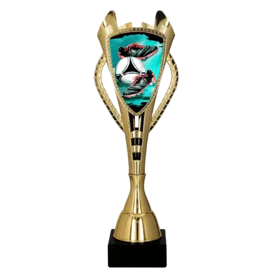 Die Trophäe besteht aus strapazierfähigem, leichtem Kunststoff, was sie besonders handlich und langlebig macht. Blickfang ist das Emblem mit einer Grafik, die einen Fußball und klassische Stollenschuhe zeigt – unverzichtbare Elemente jedes Fußballspiels.