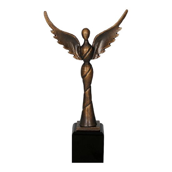 Die Trophäe besteht aus hochwertigem synthetischem Harz in metallischem Braun. Das zentrale Motiv ist eine Figur mit erhobenen Flügeln. Die Flügel sind nicht nur dekorativ, sondern ein deutliches Symbol für Wachstum, Mut und das Überwinden eigener Grenzen. Die spiralförmige Gestaltung des Körpers verleiht Dynamik und unterstreicht die Idee des Aufstiegs, der Überwindung von Hindernissen und des Strebens nach Perfektion.